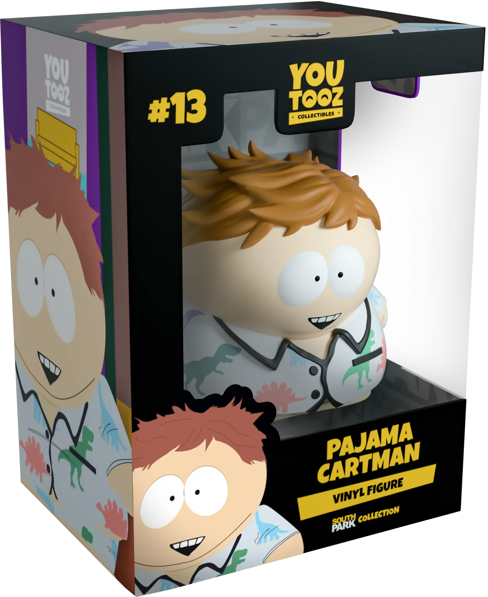Krásné ráno od samotného Cartmana! Taky bych každé ráno vypadal tak šťastně, zvlášť kdybych měl tohle neuvěřitelně promočené pyžamo s dinosaury! Cartman měří 8,6 cm a je vidět čerstvě probuzený z dobrého nočního spánku, v pyžamu sladěném podle vašich představ. Horní i spodní díl jsou světle šedé barvy, doplněné dinosauřím vzorem na horní části a kalhotami v různých barvách, jako je červená, zelená, modrá a fialová. Cartman má vlasy, které zdánlivě leží, a na tváři se mu rozevřený úsměv. Vnější strana jeho dvoustěnného obalu zobrazuje vnitřek jeho pokoje s oblečením rozházeným po podlaze. Uvnitř je logo South Parku, které se opakuje přes šedý vzor. Ochranný obal zobrazuje Cartmana, Stana, Kennyho a Kylea, jak vykukují z rohů na černém pozadí. Tento sběratelský kousek je dodáván v reliéfním matném ochranném vnějším obalu a plastovém chrániči na míru pro maximální ochranu během přepravy.