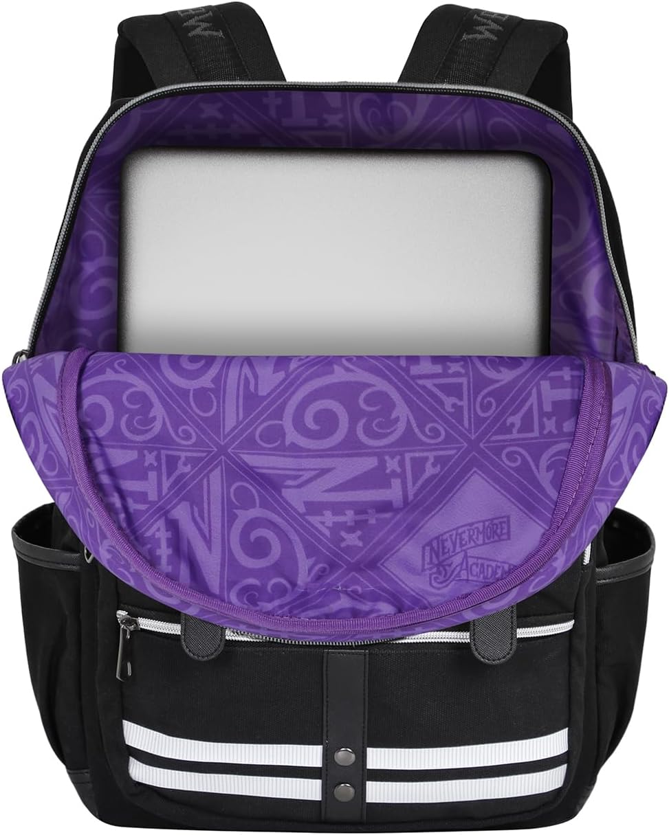Karactermania představuje svou řadu vysoce kvalitních batohů s oblíbeným seriálem Wednesday od Netflixu. Objevte znovu svět seriálu Wednesday Addams s tímto skvělým batohem v retro stylu, který má dvě přihrádky na zip překryté klopou na popruhy, vnitřní podšívku s polstrovanou kapsou na elektroniku a dvě boční kapsy. Je také vybaven zadním popruhem na zavazadla a nastavitelnými polstrovanými ramenními popruhy.