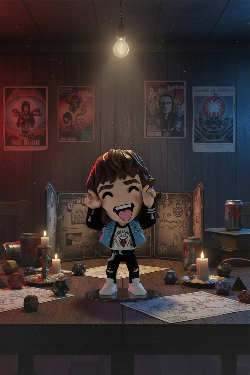 Eddie har fået besked om at vende tilbage til Youtooz som en del af deres nye kampagne! Han løfter sine ringformede hænder for at lave horn på begge sider af ansigtet og stikker tungen ud. Han er 12,5 cm høj og har en tyk bølge af mørkebrunt hår, der falder ned ad ryggen i en tyk bølge. Han er iført den sødeste ærmeløse blå denimvest med mærker og nåle over en sort jakke og en hvid skjorte med Hellfire Club-logoet på forsiden. Hans stramme sorte jeans er revet i stykker ved knæene og prydet med en tyk sølvkæde og en sort bandana. Ydersiden af hans emballage ser ham stå på frokostbordene i en stærkt oplyst cafeteria, mens indeni er en sort, klæbrig grød, der løber i slyngtråde mod en sort baggrund. Beskyttelsesomslaget genskaber "Op og Ned" med et forfaldent hus og snoede træer, mens hans silhuet kan ses gennem det store gennemsigtige udstillingsvindue på forsiden. Dette samlerobjekt leveres i et beskyttende, præget, mat yderomslag og en specialfremstillet plastikbeskytter for maksimal beskyttelse under forsendelse.
