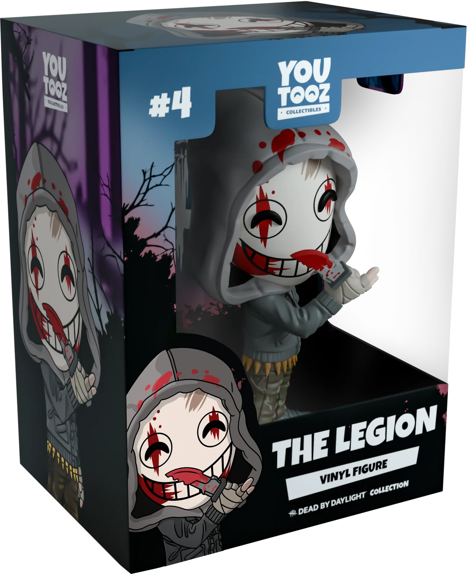 The Legion are making their way into Youtooz in a violent frenzy! Standing 12cm tall and holding a blood-soaked hunting knife in a bandaged hand with 2 fingers in the air, their grinning white masks peer through the thick hood of their jacket and are smeared with the bright red remains of their latest victim. With supply pouches on their grey-blue jacket and brown camouflage pants, they wear a yellow bullet belt around their waist and sturdy grey boots. The outside of their packaging shows the Legion looking at themselves in a mirror with their hands pressed against the glass. While the inside is a forest in black silhouette with a glowing red and blue mist and the white "Dead by Daylight" logo on the back, this sinister motif is then continued on the protective sleeve with dark trees completely surrounding it while their silhouette can be seen through the large transparent window on the front. This collectible comes in a protective, embossed, matte outer sleeve and a custom-sized plastic protector for maximum protection during shipping.