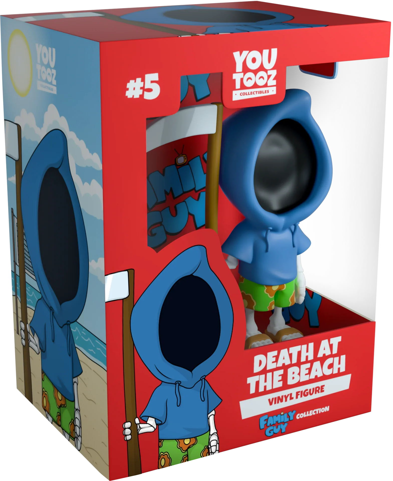 Kuolema on 11 cm korkea, valmiina nauttimaan auringosta ja surffaamaan rannalla. Oikeassa kädessään hän pitelee uskollista viikattettaan. Kasvot varjossa hänellä on yllään sininen huppari ja vihreät uima-asut, joita koristaa trooppinen kukkakuvio. Hän on parina koiransa kanssa, joka on aivan hänen vieressään. Kaksiseinäisen pakkauksen ulkopuolella on kuvattuna ranta, kaunis aurinkoinen päivä pyyhkeiden ollessa levitettyinä hiekalle. Sisäpuolella on punainen tausta, jossa on Family Guy -logokuvio. Suojatasku on ikoninen kohtaus punaisine ja kultaisine verhoineen, joka näkyy nimikkojaksossa. Tämä keräilyesine toimitetaan suojaavassa mattapintaisessa, kohokuvioidussa ulkotaskussa ja mittatilaustyönä tehdyssä muovisuojuksessa, joka tarjoaa maksimaalisen suojan kuljetuksen aikana.