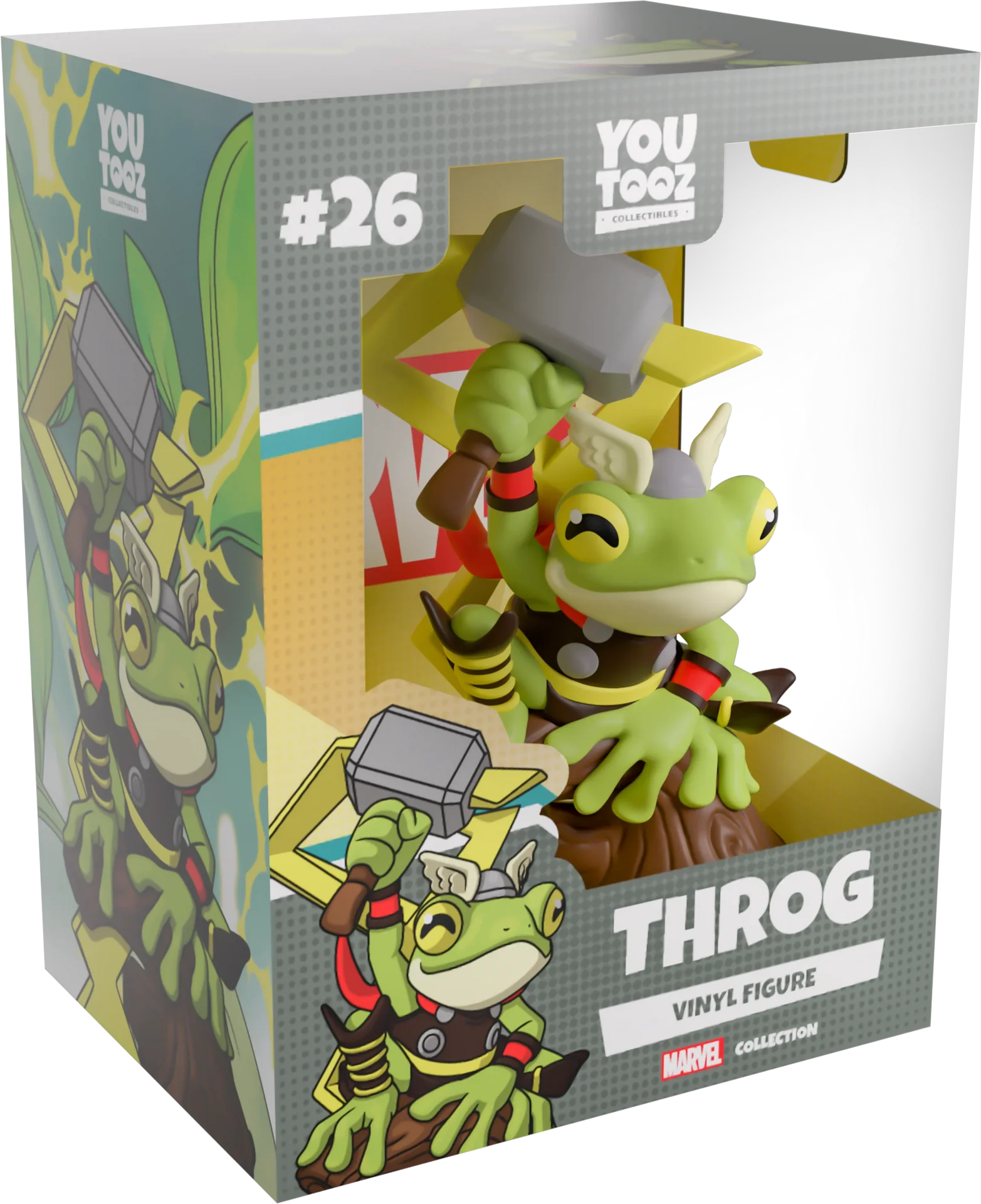 Hører du tordenen i det fjerne? Ser du lynet?! Det kan bare bety én ting: Tordenguden er her! Vent litt ... Hvem er det?! Sittende på toppen av en knudrete, 13 cm høy trestokk og løfter Frogjolnir høyt opp i luften mens den sender en taggete strøm av elektrisitet bak seg, krysser et bredt glis det amfibiegrønne ansiktet mens en vinget hjelm hviler på hodet. Med et par enorme glødende gule øyne er den kledd i passende asgardisk antrekk med en tunika og en lang, flagrende rød kappe, mens den har på seg håndledds- og leggbeskyttere. På utsiden av emballasjen ser du den sitte på toppen av en gren mens lyn blinker rundt den, mens innsiden er fylt med strålende stråler av gyllent lys. Beskyttelseshylsteret fortsetter deretter lynet gjennom det, mens silhuetten kan sees gjennom det store, klare vinduet på forsiden av pakken. Dette samleobjektet kommer i et beskyttende, preget, matt ytre omslag og en spesialtilpasset plastbeskytter for maksimal beskyttelse under frakt.