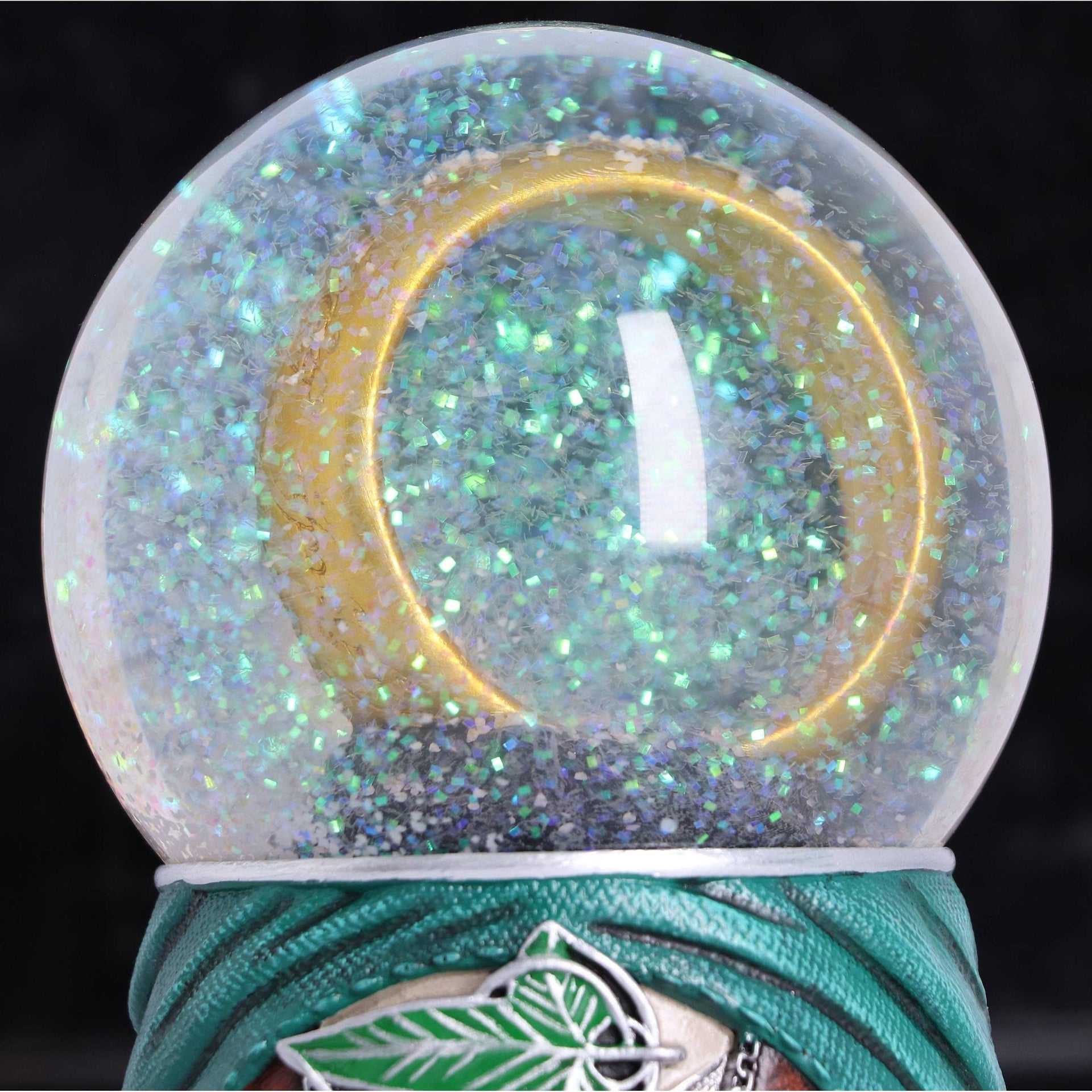 La base de cette boule à neige magnifiquement conçue est formée par la cape verte de Frodon, le devant de son blazer marron boutonné et sa chemise blanc cassé. L'emblématique feuille de Lorien est placée juste en dessous du bord supérieur et constitue la pièce maîtresse parfaite. Au verso, elle porte la citation "Même la plus petite personne peut changer le cours de l'avenir". À l'intérieur du globe, l'anneau unique occupe le devant de la scène, entouré de l'inscription "One Ring to Them All". Cette pièce au design exquis est coulée dans la plus fine résine "elfique" avant d'être peinte à la main par des experts.