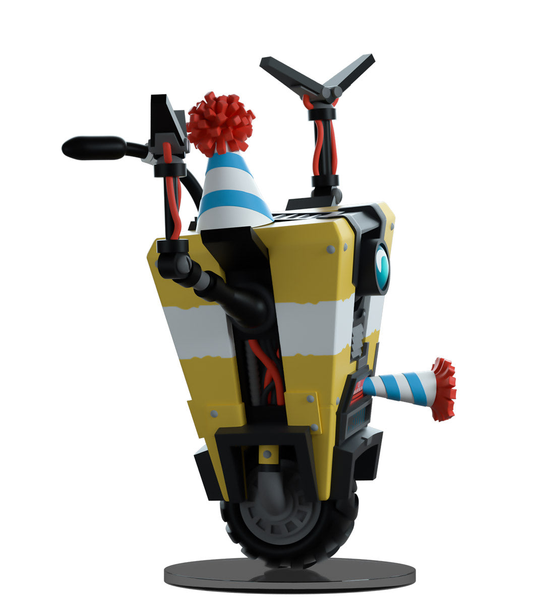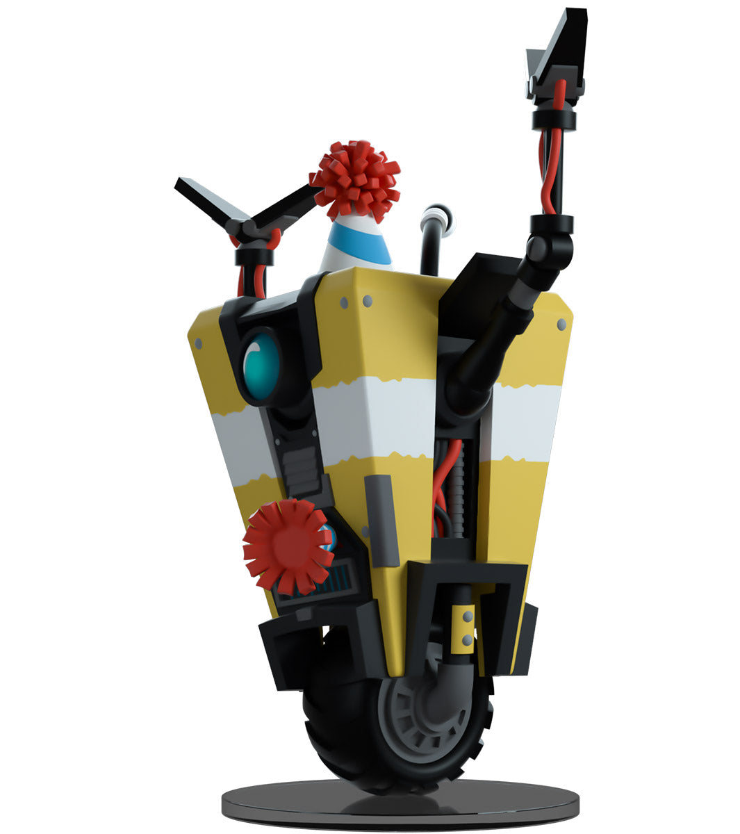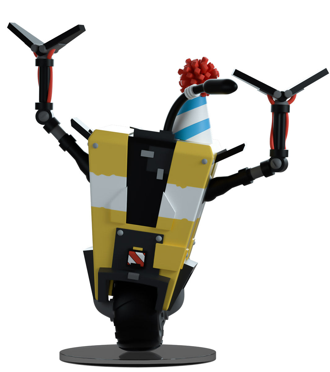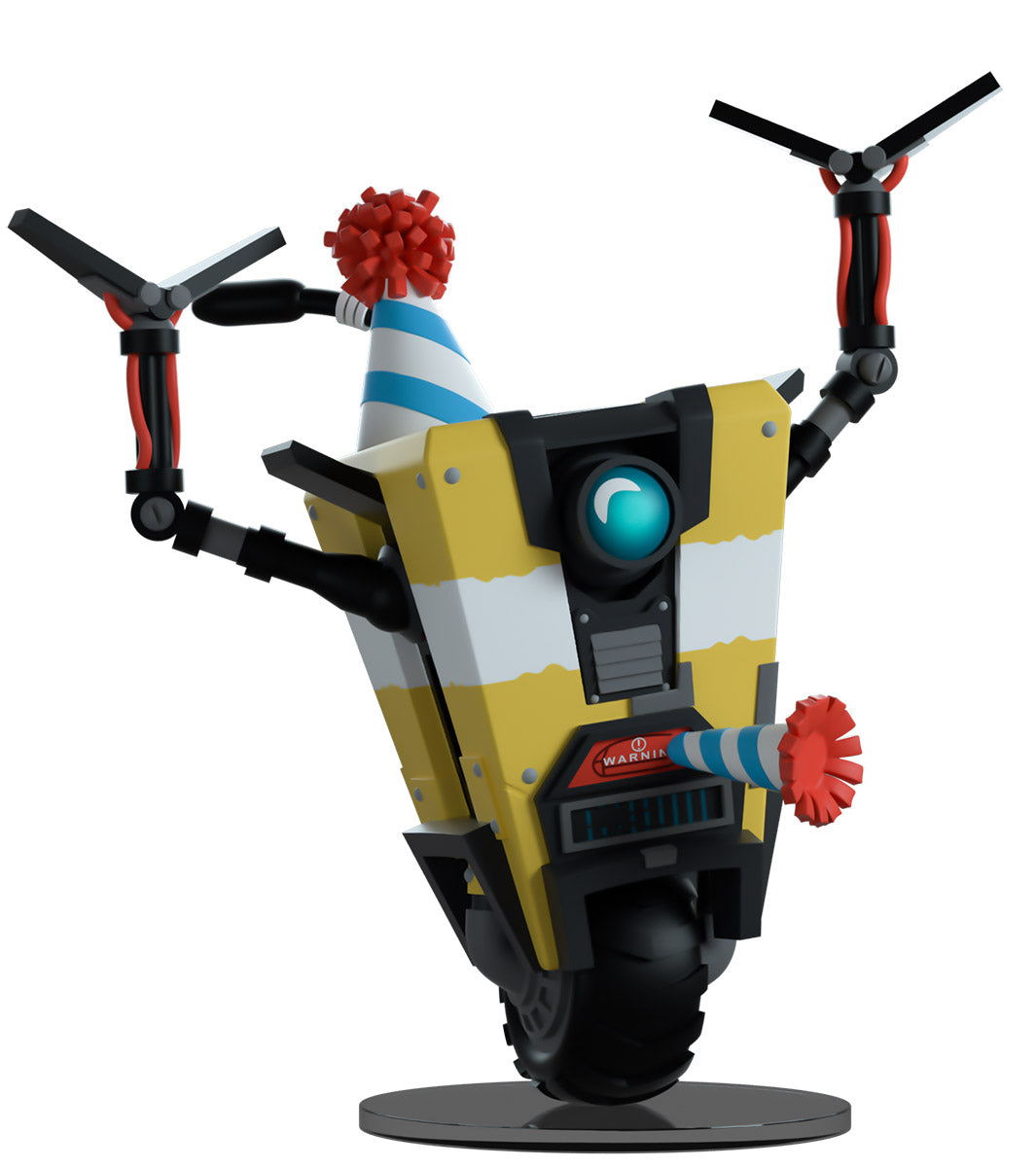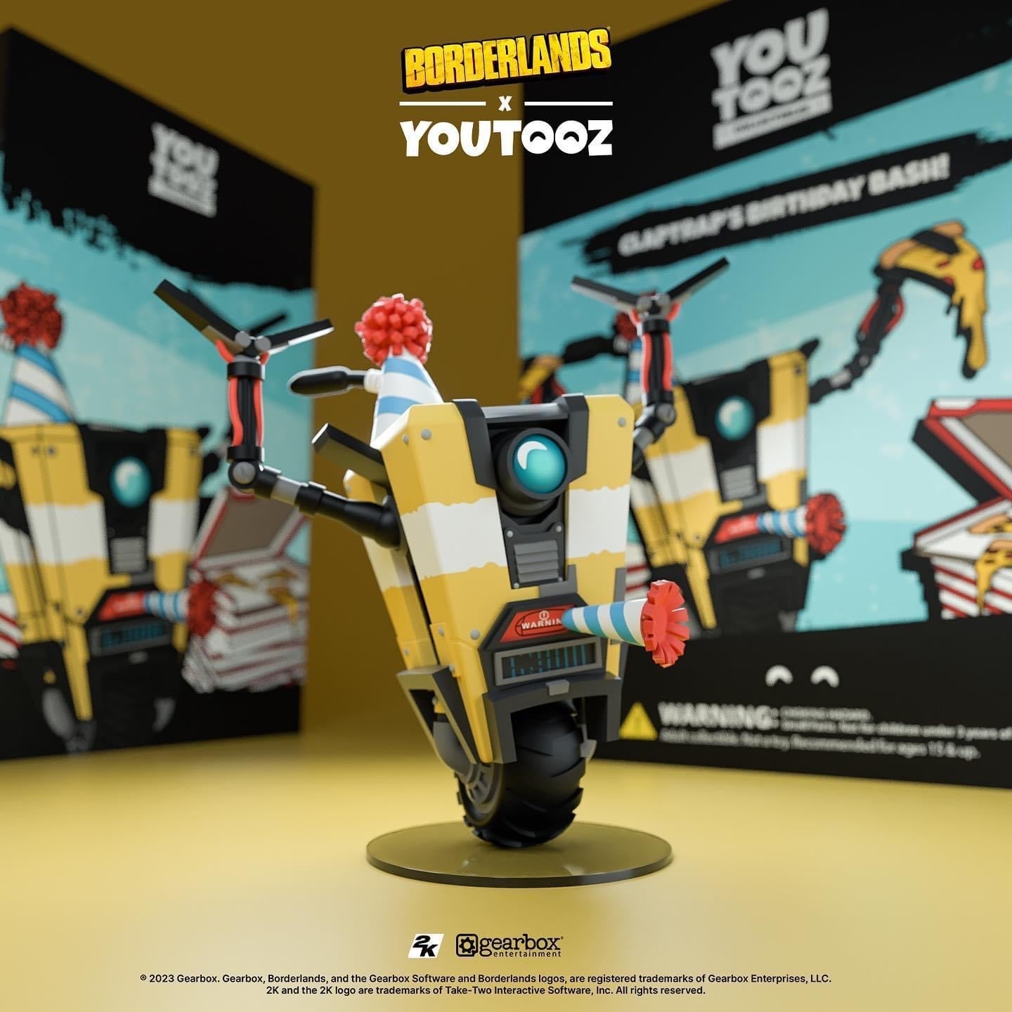 C'est l'heure de faire la fête ! Je veux dire, comment pourrions-nous ne pas le faire ? C'est le premier album de Claptrap sur Youtooz ! Mesurant 4,9 pouces avec ses minces bras métalliques noirs levés en signe de célébration, il porte un chapeau de fête bleu rayé avec un pompon rouge vif qui correspond au souffleur venant de sa… bouche ? Avec un œil circulaire bleu profond à l'avant et des écrans robotiques en dessous, il est peint en jaune vif avec une bande blanche en son centre tandis que son corps rigide se penche sur le côté en équilibre sur la roue robuste à sa base. L'extérieur de son emballage le montre en train de profiter d'une fabuleuse soirée pizza, tandis que l'intérieur est d'un gris foncé orné du logo répétitif du coffre-fort. L'emballage de protection voit Claptrap posé devant un logo de coffre-fort éclaboussé sur un fond jaune et gris tandis que sa silhouette peut être vue à travers la grande fenêtre transparente située à l'avant. Cet objet de collection est livré dans une pochette extérieure de protection mate en relief et un protecteur en plastique de taille personnalisée pour une protection maximale pendant l'expédition. Cet objet de collection a été conçu en collaboration avec @therealracckun.
