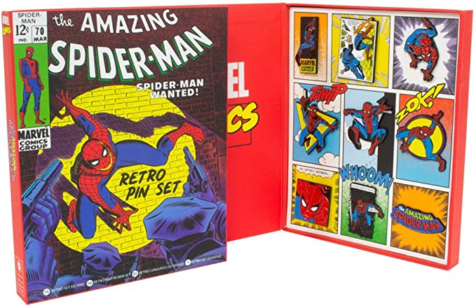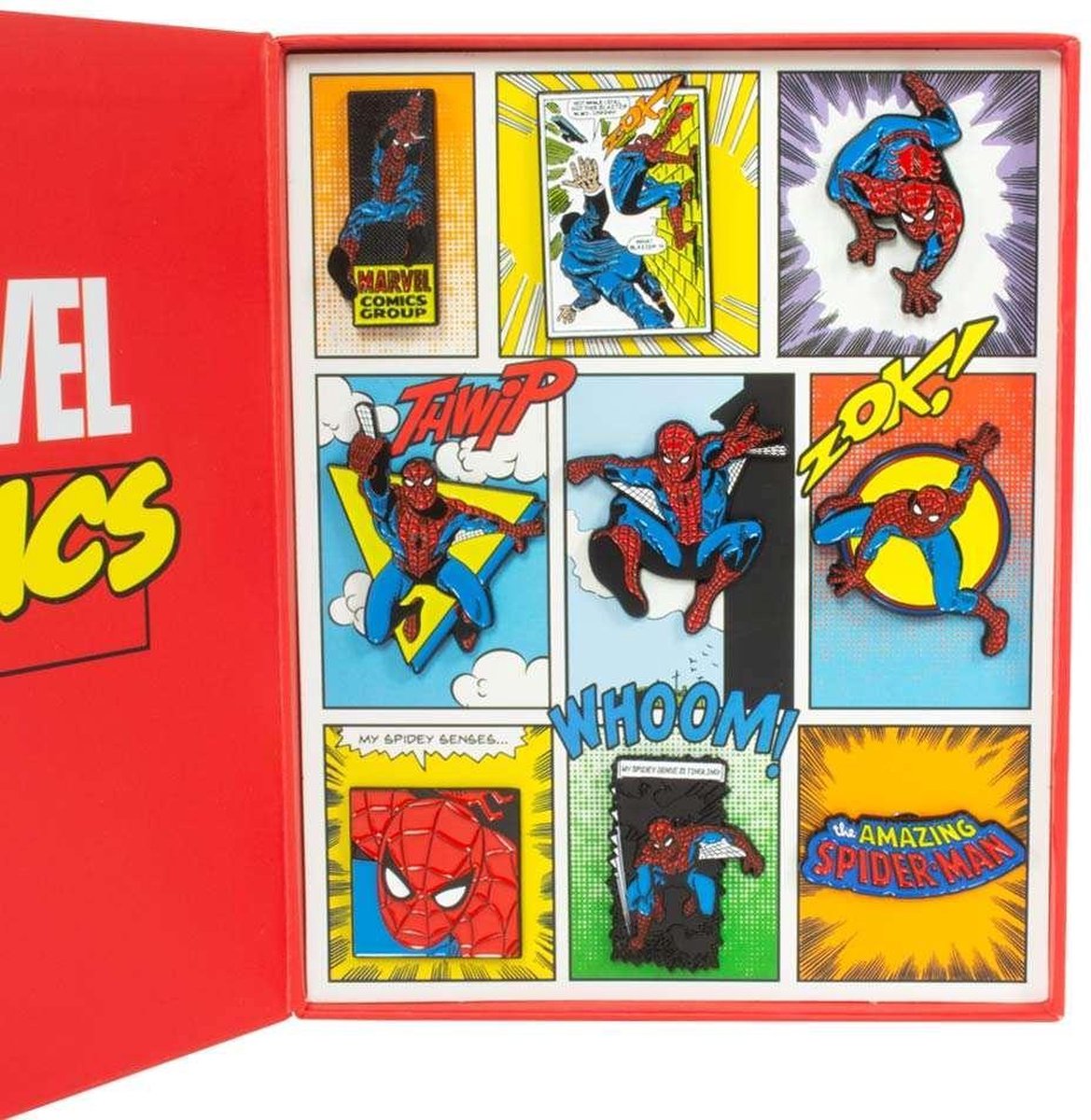 - Les badges d'épinglette incluent le logo rétro de Spider-Man, des poses et des photos d'action.