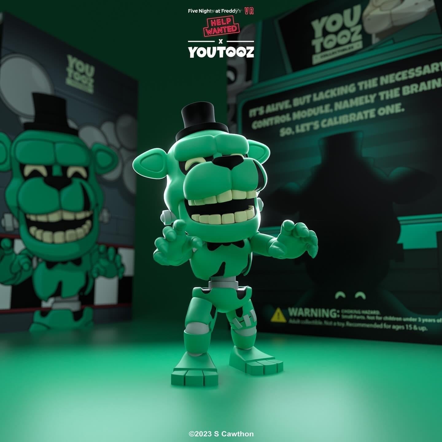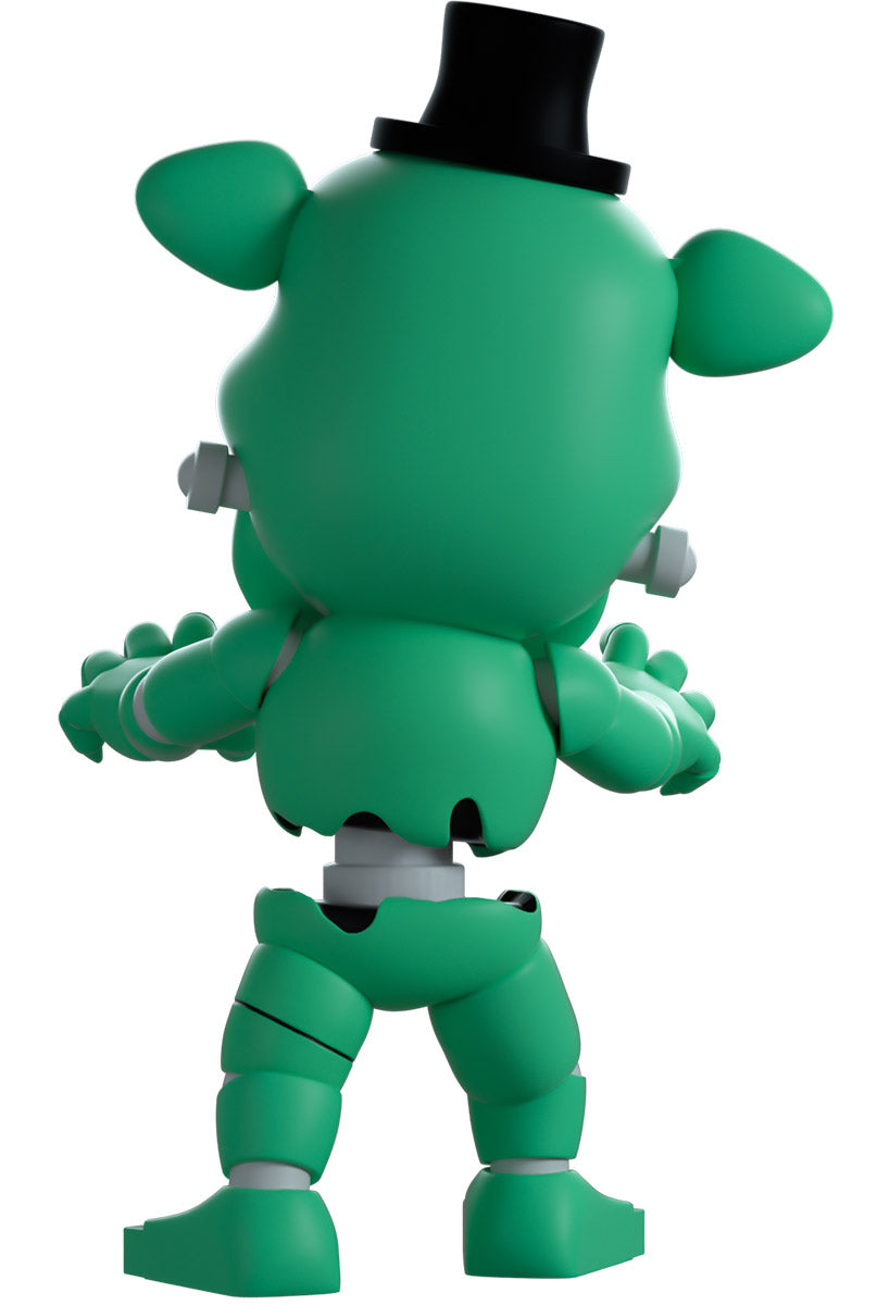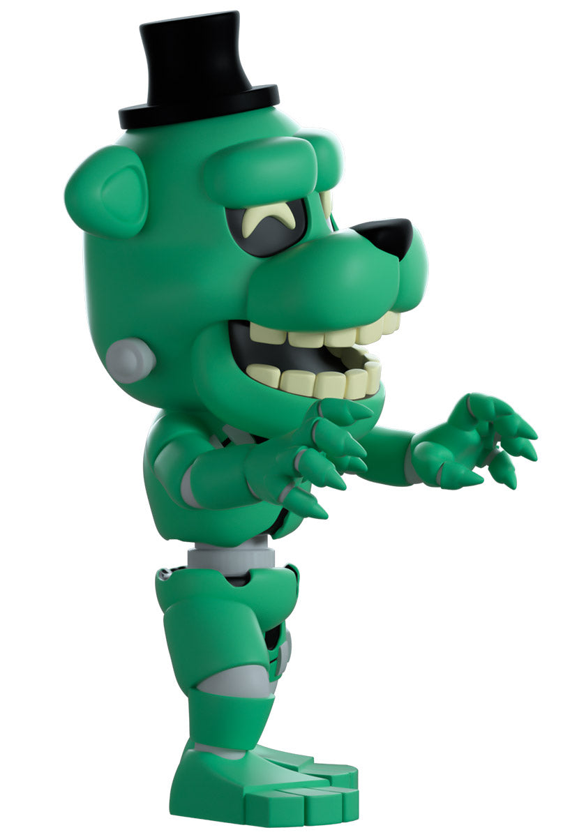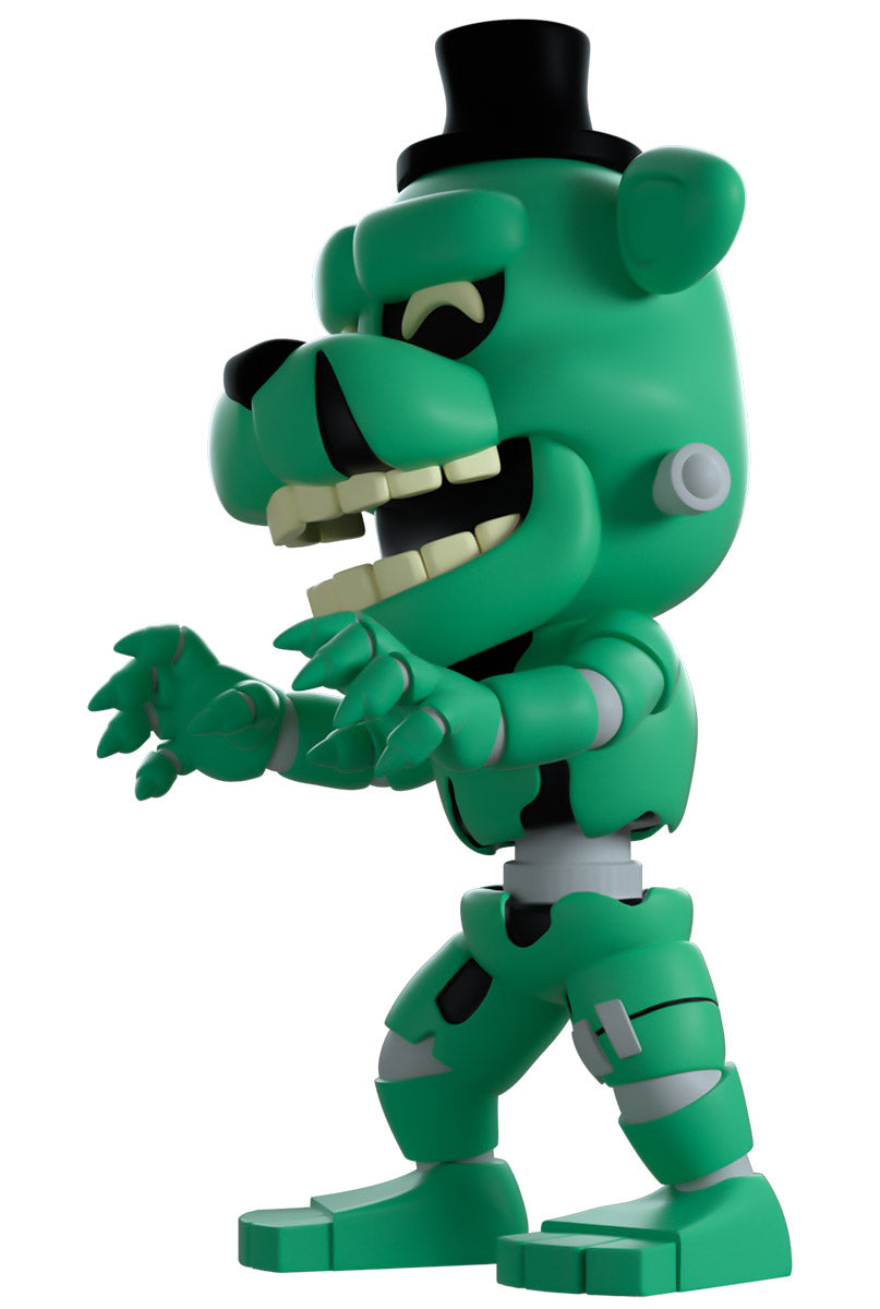 S'avançant à 4,8 pouces de hauteur avec ses mains griffues tendues et un sourire terni étendu sur son visage joyeux, un petit chapeau noir repose sur sa tête et des sourcils épais tandis que des oreilles pointues dépassent sur les côtés. Portant un petit nœud papillon noir avec un corps animatronique vert délabré qui a une chance sur six (1 sur 6) d'être une version de chasse qui brille dans le noir, des membres segmentés qui révèlent un endosquelette métallique descendent jusqu'à des pieds robustes. L’extérieur de son emballage montre la silhouette sombre de Dreadbear devant la lueur vert foncé d’un moniteur, qui se poursuit vers l’intérieur avec un motif carré et le logo « Security Breach ». Le manchon de protection est d'un bleu métallique foncé avec des tuyaux gris et des fils colorés qui le traversent et affiche la silhouette de Dreadbear à travers la grande fenêtre transparente située à l'avant. Cet objet de collection est livré dans une pochette extérieure de protection mate en relief et dans un protecteur en plastique de taille personnalisée pour une protection maximale pendant l'expédition.
