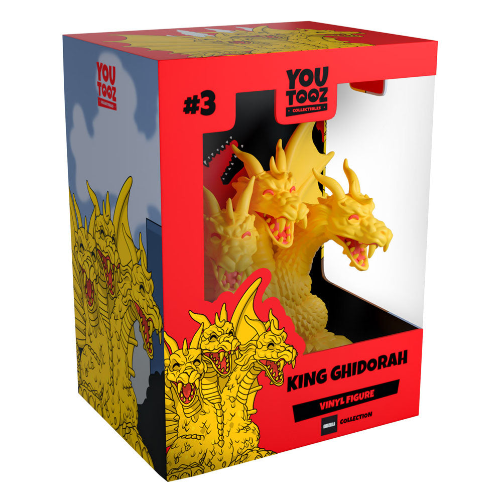 Le roi Ghidora s'écrase sur Youtooz et se prépare à usurper le trône en tant que roi des monstres ! L'ultime ennemi juré de Godzilla mesure 3,9 pouces de hauteur avec ses trois têtes cornues menaçantes élevées sur des cous épais, chaque bouche à crocs grande ouverte révélant son intérieur charnu rouge. Son magnifique corps doré est couvert de rangées d'écailles impénétrables tandis que d'énormes ailes majestueuses se déploient dans son dos et que des queues à double pointe se déploient sur le côté. Son emballage extérieur le montre libérant un faisceau de foudre dévastateur de chaque bouche pour ruiner une ville. L'intérieur voit la silhouette noire de Godzilla sur un fond rouge vif. Alors que chaque panneau de la pochette de protection est orné d'images de Mothra, Mecha Godzilla et King Ghidora rappelant les affiches de films classiques.