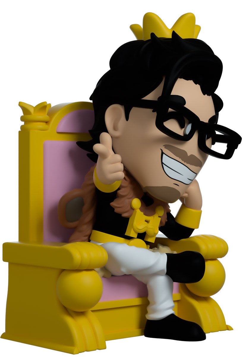 Le roi revient ! À 5,1 pouces de hauteur, Markiplier prend la place qui lui revient en tant que roi de la FNAF ! Assis au sommet de son trône bien mérité, il pose avec une main pointant un doigt vers l'extérieur de manière ludique tandis que l'autre repose sur sa joue pour relever sa tête. Son visage est plein de confiance avec un grand sourire à pleines dents qui n'est accentué que par ses sourcils levés regardant au-dessus de ses épaisses lunettes à monture noire. Il est vêtu d'une chemise noire à manches longues et d'un pantalon blanc, pour ne rien enlever à sa cape royale en peau d'ours qui est maintenue en place par un « M » doré et une chevalière moustache sur sa poitrine. Sa tenue est complétée par une ceinture dorée, des poignets et une couronne à cinq pointes. Alors que son trône doré est élégamment sculpté de fleurs délicates sur ses oreilles et de grands orbes sous les accoudoirs robustes, son siège est magnifiquement orné d'un revêtement rose clair. L'extérieur de son emballage montre Mark triomphalement sur son trône au milieu de la pizzeria faiblement éclairée entourée d'animatroniques délabrés. Tandis que l’intérieur reproduit l’emblématique salle de sécurité faiblement éclairée de la pizzeria. La pochette de protection imite les murs gris mouchetés du bâtiment avec des triangles et des affiches colorés, tandis que la silhouette de Mark regarde d’un air menaçant depuis une porte sombre. Cet objet de collection est livré dans une pochette extérieure de protection mate en relief et un protecteur en plastique de taille personnalisée pour une protection maximale pendant l'expédition.
