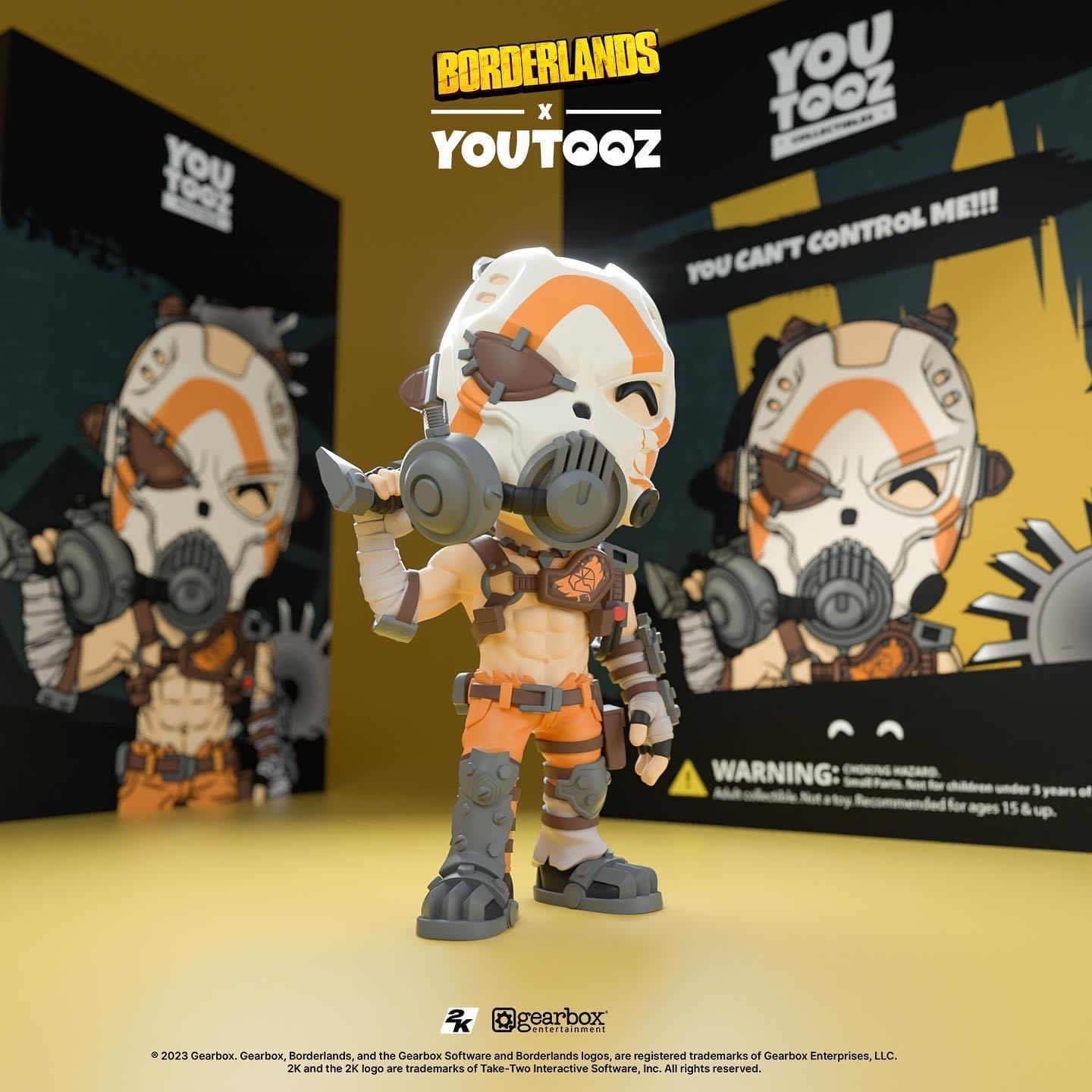 Krieg arrive en hurlant sur Youtooz avec ses débuts psychotiques ! Mesurant 4,7 pouces de hauteur avec sa fidèle hache en bandoulière sur son épaule, un masque blanc osseux est attaché à son visage avec des lanières marron et comporte une bande orange sur le devant ainsi qu'un cache-œil marron et un respirateur gris. Couvert d'un amalgame d'armures de métal et de cuir sur tout son corps, il porte un pantalon orange vif et des bouts de tissu pâle avec d'épaisses bottes en métal. L'extérieur de son emballage le voit debout avec une série de lames tournantes, tandis que l'intérieur est d'un gris foncé orné du logo répétitif du coffre-fort. L'emballage de protection montre Krieg posé devant un logo de coffre-fort éclaboussé sur un fond jaune et gris tandis que sa silhouette est visible à travers la grande fenêtre transparente située à l'avant. Cet objet de collection est livré dans une pochette extérieure de protection mate en relief et un protecteur en plastique de taille personnalisée pour une protection maximale pendant l'expédition. Cet objet de collection a été conçu en collaboration avec @therealracckun.