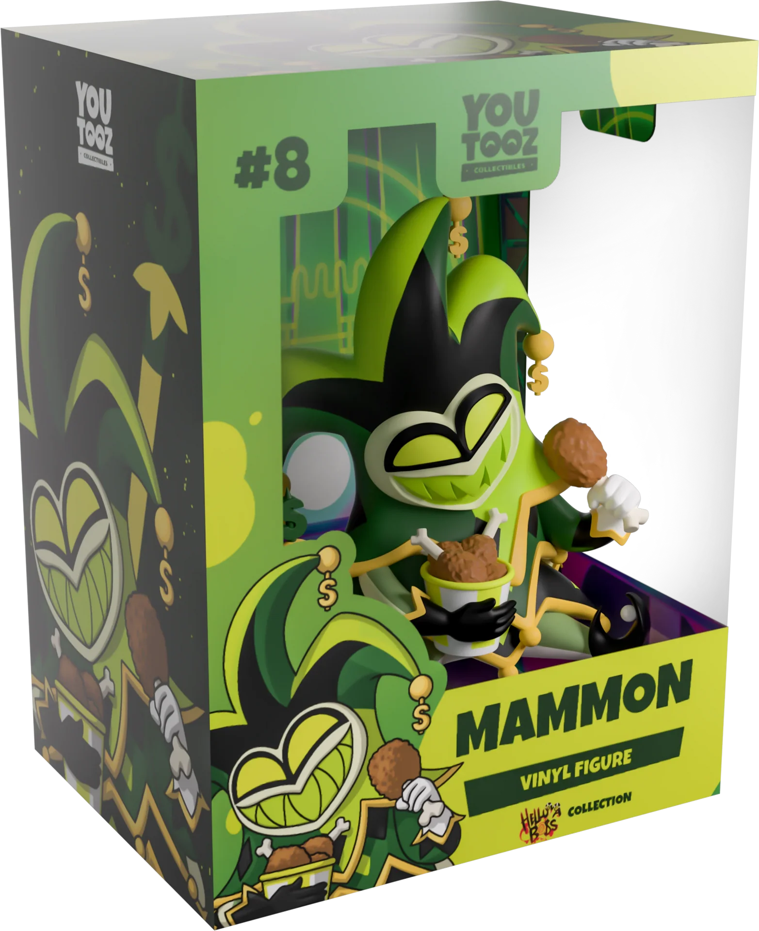 Venez vite ! Mammon est là pour montrer sa toute nouvelle attraction, ses débuts sur Youtooz ! Assis à 11,5 cm de hauteur avec ses jambes écartées, un sourire maladif aux dents vertes brille sur son visage en forme de cœur qui se trouve niché dans son grand chapeau de bouffon à 3 pointes avec une bordure dorée et des symboles de dollar suspendus à chaque pointe. Se préparant à dévorer l'os de viande dans sa main droite levée alors qu'il berce un seau de nourriture près de sa poitrine, l'une de ses mains tient un sceptre doré et vert à ses côtés alors qu'il porte une tenue superposée de robes vertes et noires pointues recouvertes d'un motif de diamants dorés. L'extérieur de son emballage voit leur silhouette verte et galbée sur un fond sombre, tandis que l'intérieur regarde une scène éblouissante qui brille de lumières vives. La pochette de protection est ensuite décorée de rayures diagonales vertes et jaunes et imprimée avec le logo « Helluva Boss » tandis que leur personnage est visible à travers la grande fenêtre transparente située à l'avant. Cet objet de collection est livré dans une pochette extérieure protectrice mate et gaufrée et un protecteur en plastique de taille personnalisée pour une protection maximale pendant l'expédition.
