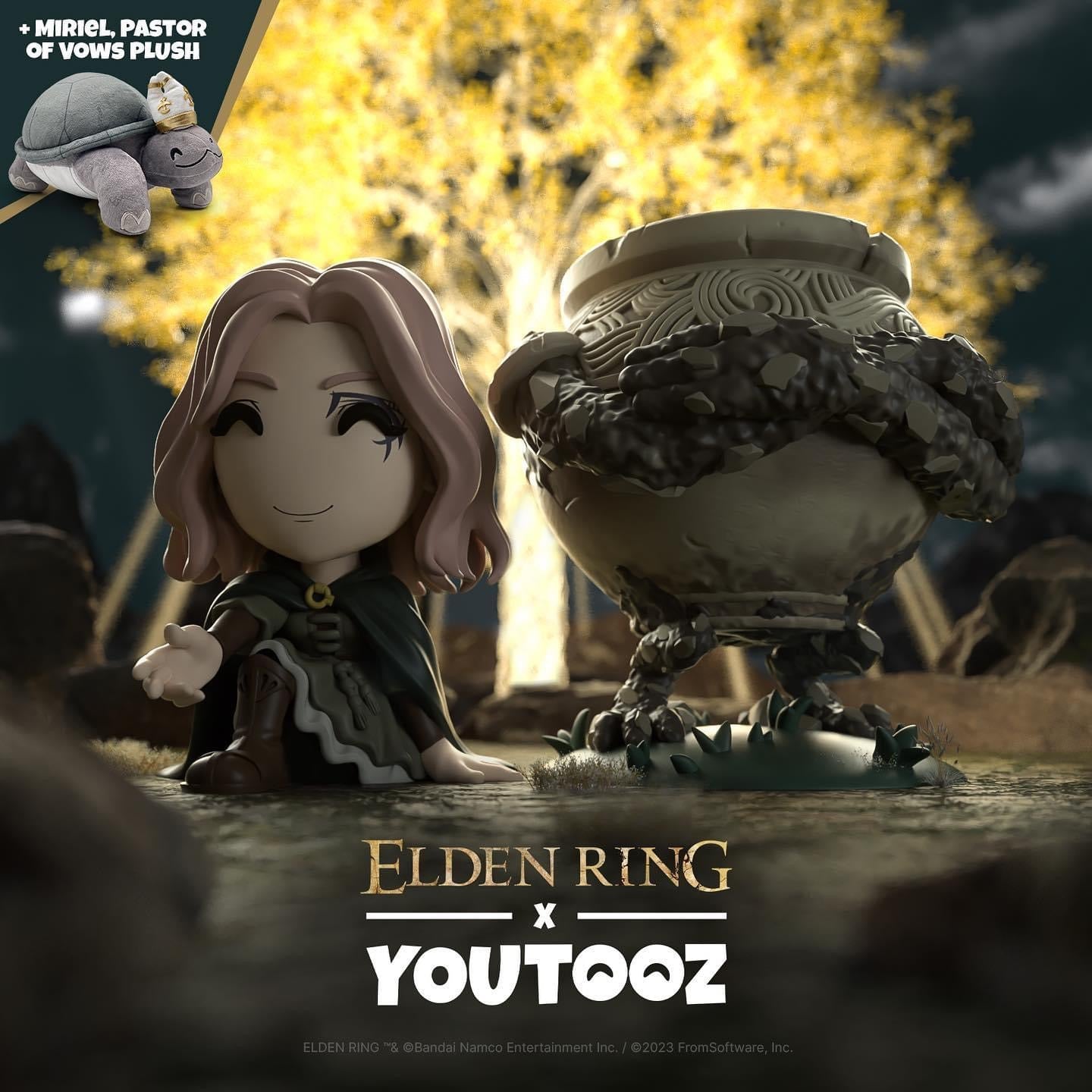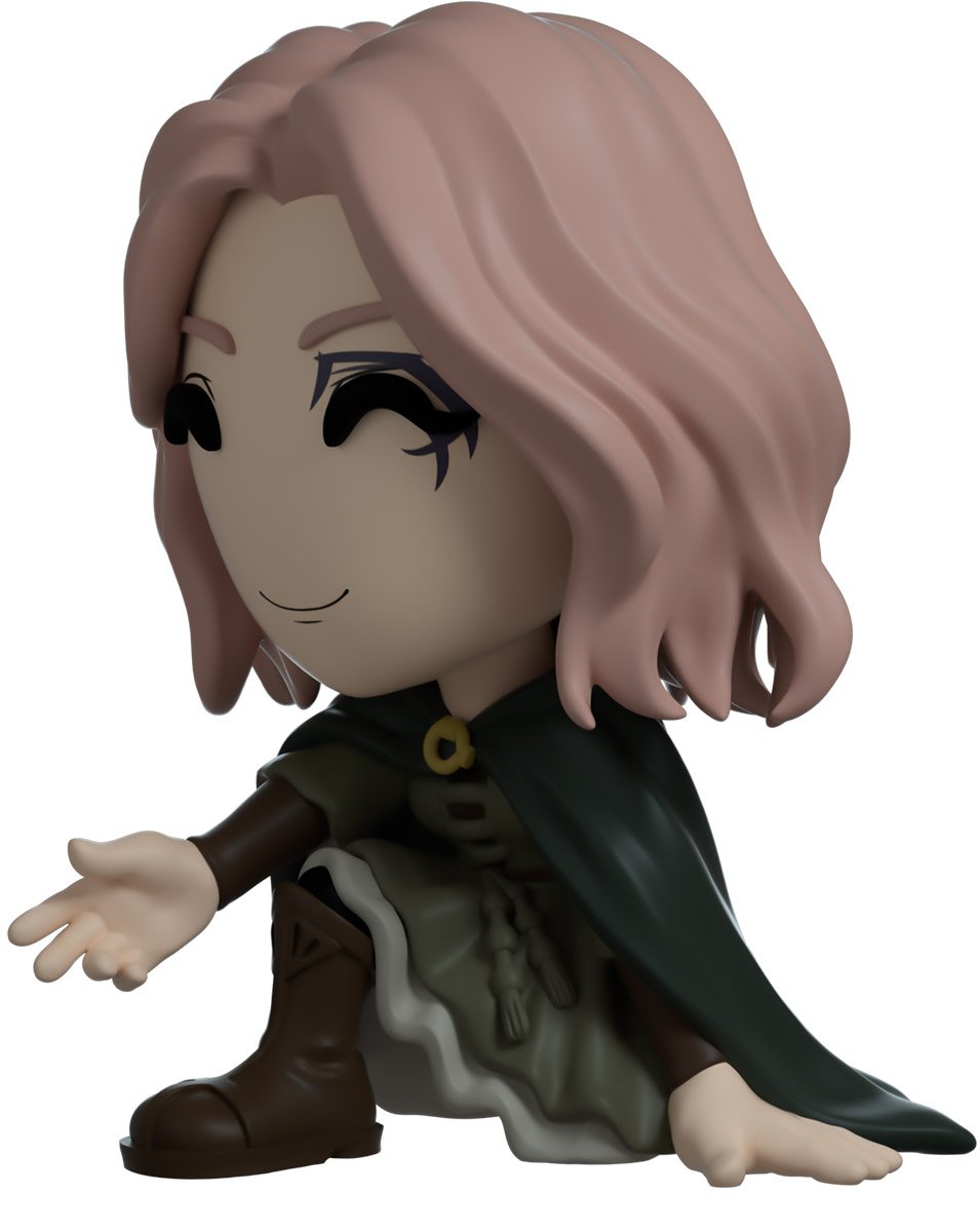 Melina débarque chez Youtooz pour guider nos âmes ternies sur le bon chemin ! À 3,7 pouces de hauteur, elle est allongée sur un genou avec une main délicate tendue, son doux sourire et ses yeux doux vous invitent alors qu'une marque sombre peut être vue sur son œil gauche, jetant un coup d'œil sous ses cheveux brun fraise jusqu'aux épaules. Habillée à la fois pour le voyage et la bataille, elle porte une longue cape verte cintrée au cou avec un cercle doré sur l'armure de son voyageur alors que les volants légers de sa robe ébouriffent de son ourlet, car ses bras et ses jambes sont protégés par des revêtements marron et un genou épais. bottes hautes. L'extérieur de son emballage voit un site de grâce éclairant la campagne sombre avec une lumière tourbillonnante. L'intérieur reproduit les bruns froids de la carte du jeu. La pochette de protection vous place dans les eaux d'un ravin rempli de brume sombre et est imprimée du logo doré Elden Ring avec des motifs runiques embellissant les coins.