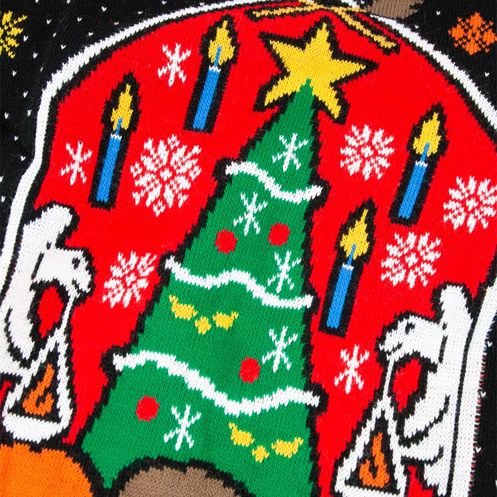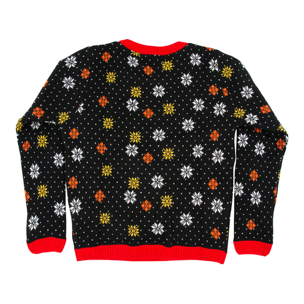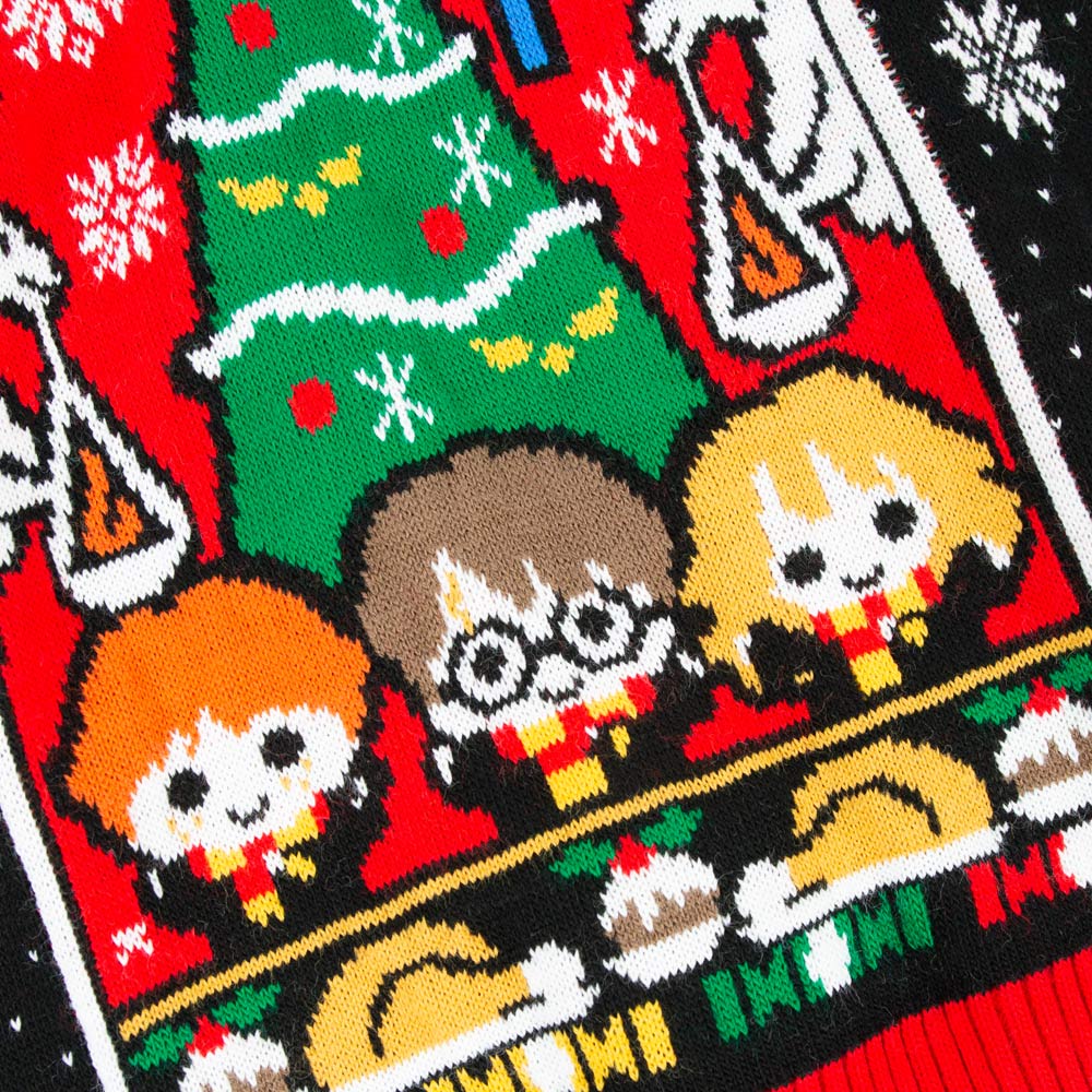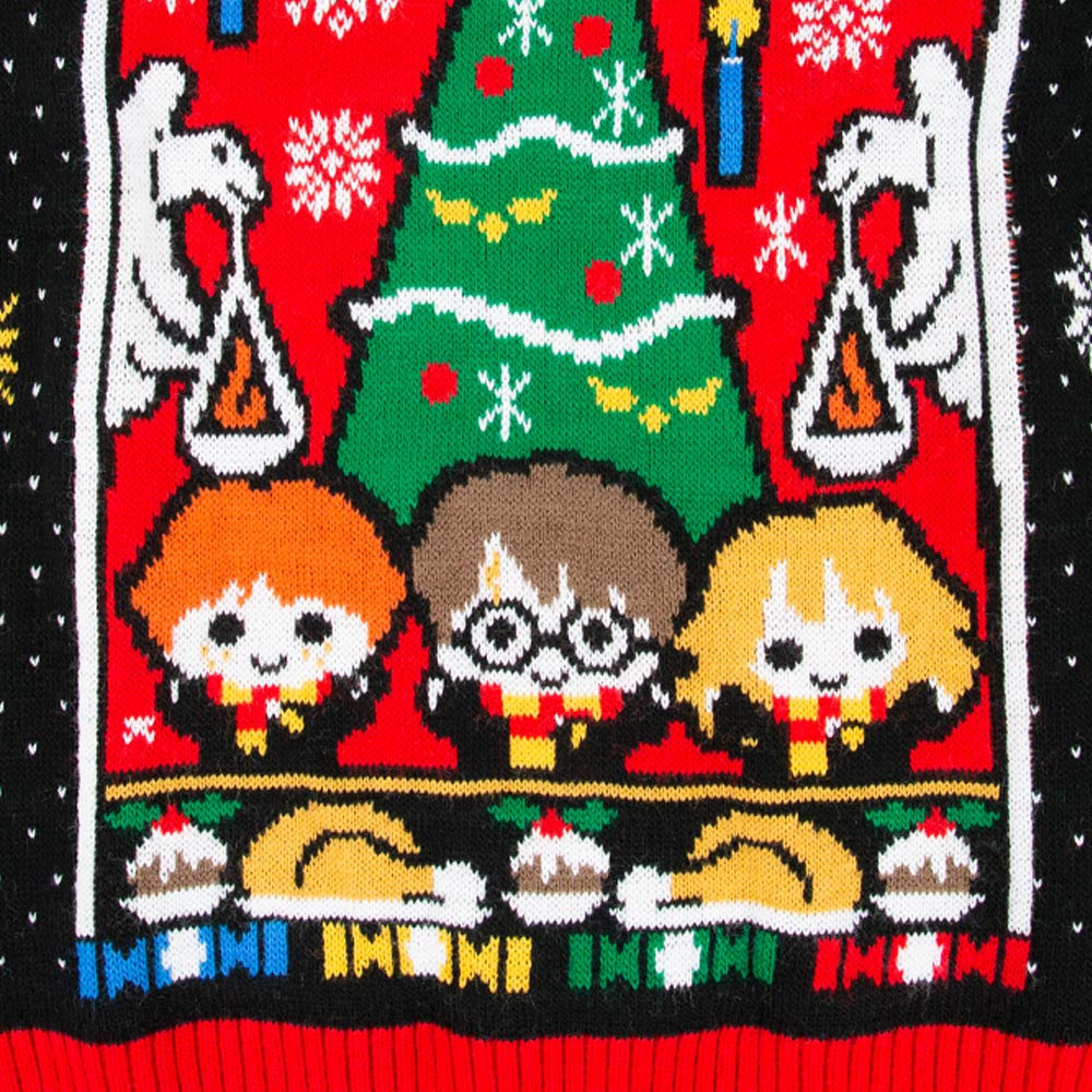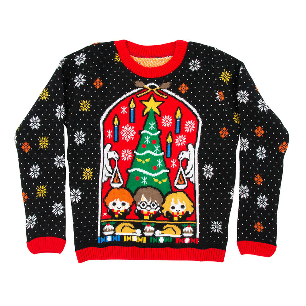 Quoi de mieux que de passer vos vacances à Poudlard aux côtés de Harry, Ron et Hermione! Ce pull 100% tricot met en valeur la Grande Salle enchantée avec une touche de Noël, avec l'un des douze arbres de Noël sur le devant, des bougies volantes, des gargouilles et plus encore! Ce pull d'hiver est un article incontournable pour tout amateur de Harry Potter.