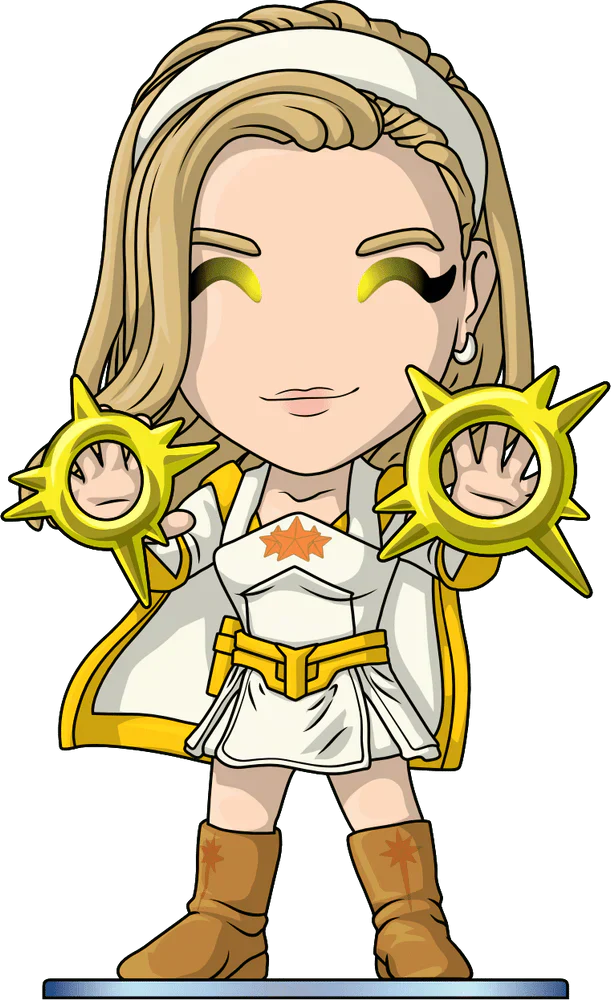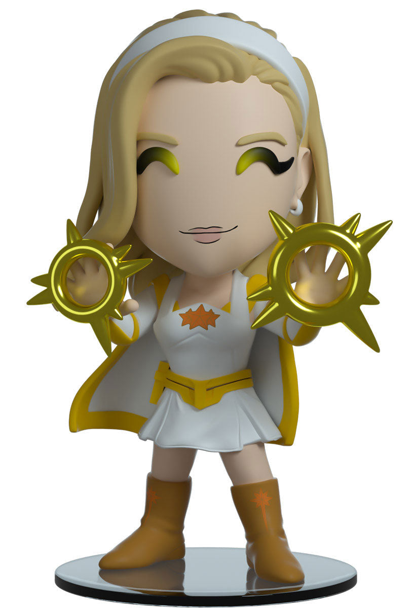 La chérie de l'Amérique est passée de la scène du concours aux Seven et maintenant à Youtooz ! Debout à 4,5 pouces de hauteur, elle a posé les bras tendus, laissant échapper deux anneaux de lumière éblouissants pour ses paumes ouvertes alors que ses yeux brillent d'un éclat doré. Sachant qu'elle a le dessus, un joli sourire narquois traverse ses lèvres alors que ses longs cheveux blonds tombent élégamment dans une frange repoussée et sont maintenus en place par un bandeau blanc. Portant son costume original d'une robe blanche à manches longues avec des manches longues et des embellissements jaunes, sa cape à motifs d'étoiles flotte gracieusement dans le vent. L'extérieur de son emballage voit Starlight à travers l'objectif rapproché d'un appareil photo. Alors que l'intérieur l'entoure d'un mur de briques blanches griffonné de graffitis, cela continue ensuite sur la pochette de protection avec le mur éclaboussé de sang et imprimé avec le logo "The Boys" à l'arrière.