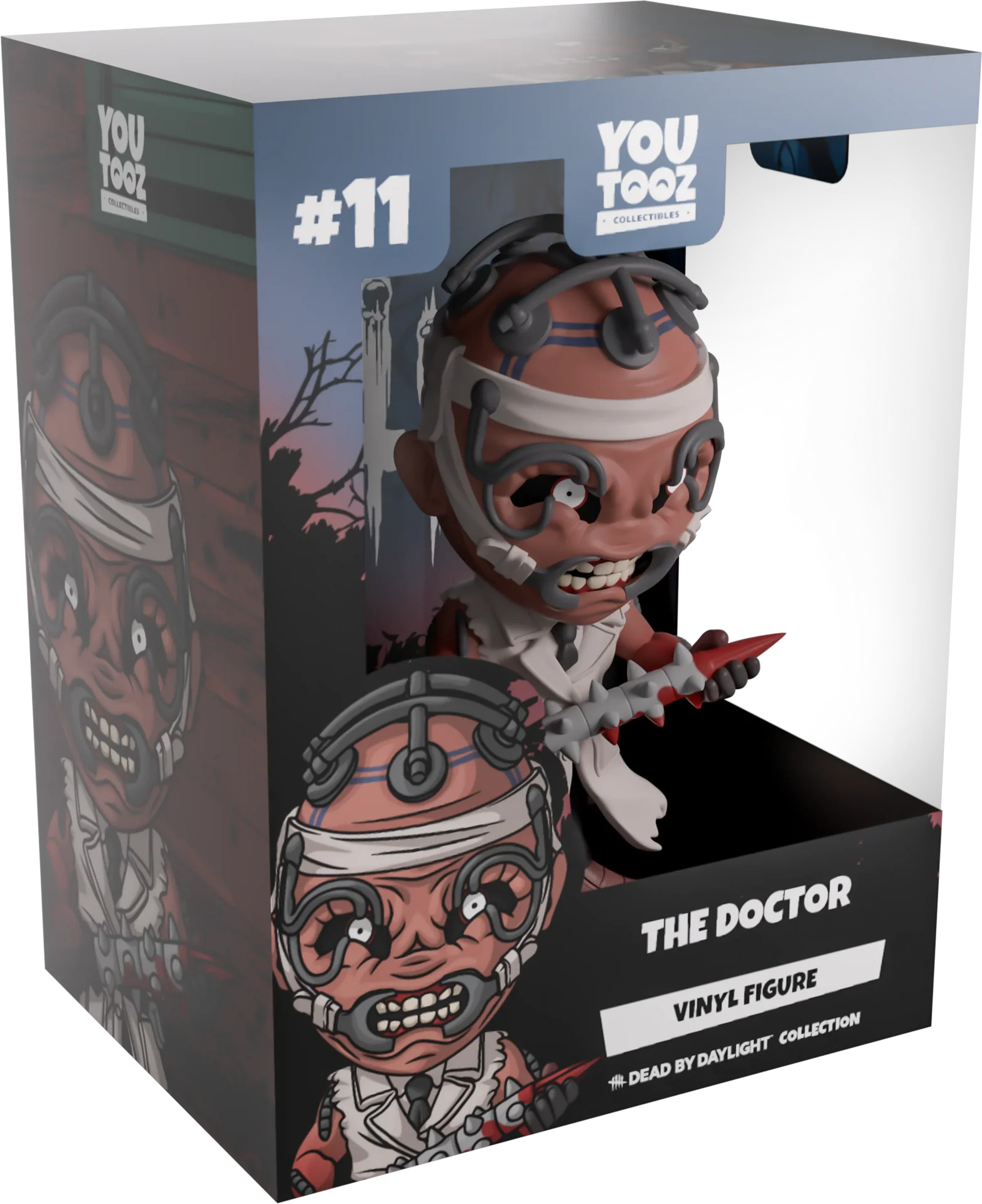 Prêt pour l'opération ? Eh bien, le Docteur est là et il est prêt à couper même si vous ne l'êtes pas ! Debout, préparé et prêt à 11,7 cm de hauteur, le Docteur tient sa pointe sanglante de manière menaçante dans ses deux mains alors qu'il est vêtu d'un pantalon noir, d'une veste marron et d'une longue blouse blanche en lambeaux déchirée aux manches et cintrée à la taille avec une ceinture noire. Avec son visage noueux déformé en un grognement involontaire, l'appareil métallique attaché à sa tête lui tire la bouche et les yeux ouverts. La boîte de présentation à fenêtre a été conçue pour présenter le Docteur derrière l'ouverture d'une porte pour vous accueillir dans son cabinet. Alors que l'intérieur est une forêt à silhouette noire avec une brume rouge et bleue brillante et le logo blanc « Dead by Daylight » à l'arrière, ce motif sinistre se poursuit ensuite sur la pochette de protection avec des arbres sombres qui l'entourent complètement tandis que leur silhouette peut être vue à travers la grande fenêtre transparente à l'avant. Cet objet de collection est livré dans une pochette extérieure protectrice mate et gaufrée et un protecteur en plastique de taille personnalisée pour une protection maximale pendant l'expédition.