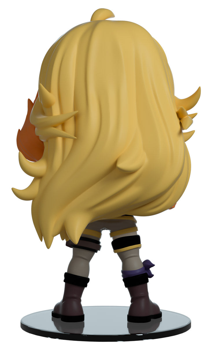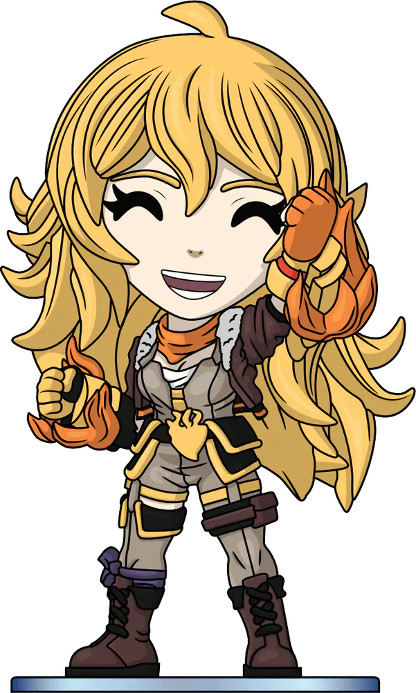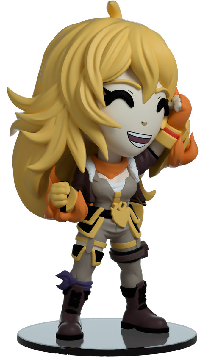 Le Y de RWBY arrive chez Youtooz ! Posée à 4,7 pouces de hauteur, Yang Xiao montre ses dents blanches nacrées avec un sourire large et radieux sur son visage. Sa main gauche est en poing et atteint le dessus de sa tête avec sa main droite en poing et vers son côté. Elle est vêtue de sa salopette kaki avec un haut tube court blanc qui ressort. Par-dessus la combinaison, elle porte une veste ample de style aviateur marron foncé avec une bordure en fourrure autour du cou et des bretelles noires et orange le long des manches. Autour de sa taille se trouve une ceinture noire et orange avec un tissu plié noir et jaune sur les côtés et en bas, elle porte des bottes hauteur genou marron foncé avec des lacets noirs et une bordure supérieure. En guise d'accessoires, elle porte son foulard orange autour du cou et son foulard violet autour de sa jambe droite. L'extérieur de son emballage montre un paysage terne et très froid avec des bâtiments de couleur sombre autour de la zone. Des plaques de neige se sont accumulées à plusieurs endroits. L'intérieur est un fond blanc avec des pétales de fleurs jaunes flottant. Cet objet de collection est livré avec une pochette extérieure de protection et un protecteur en plastique de taille personnalisée pour une protection maximale pendant l'expédition.